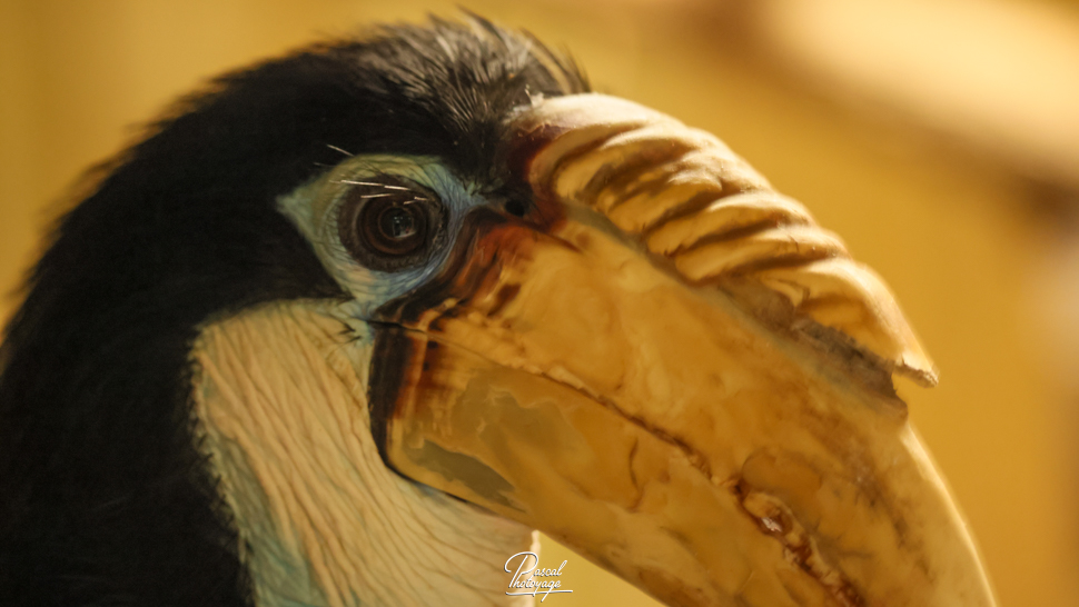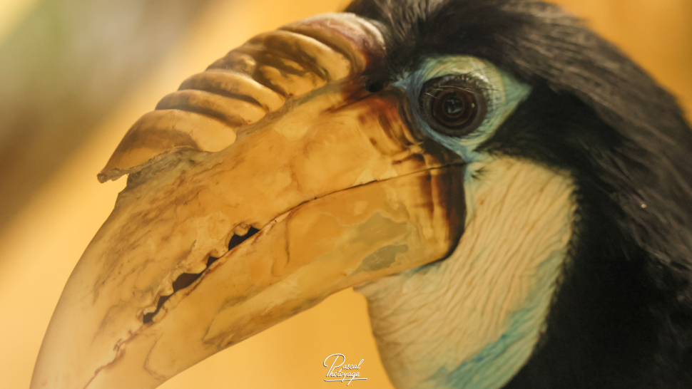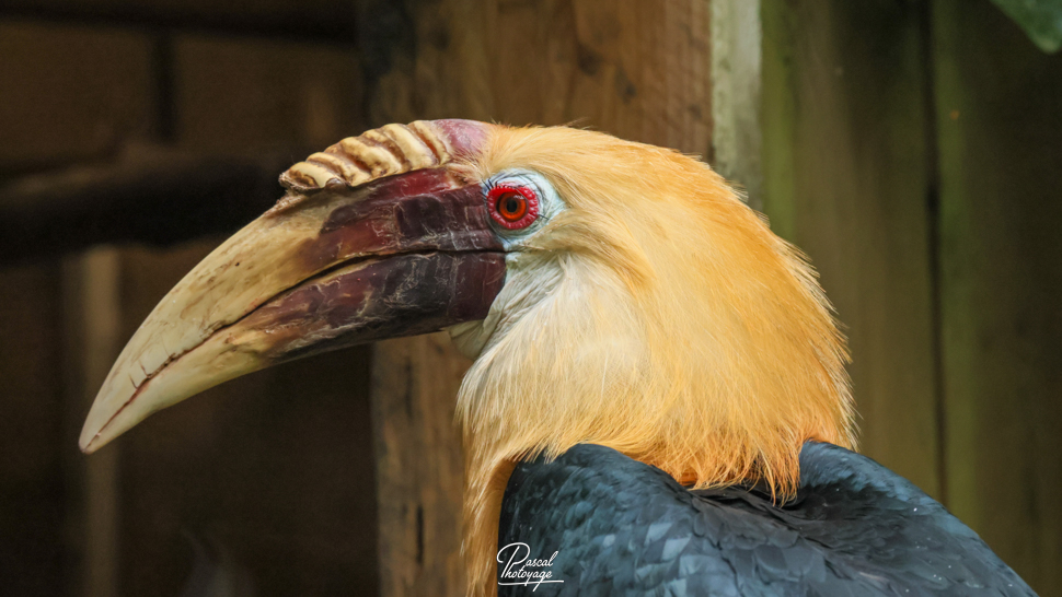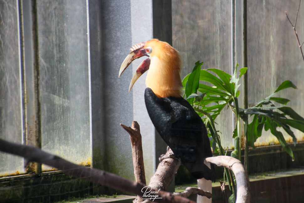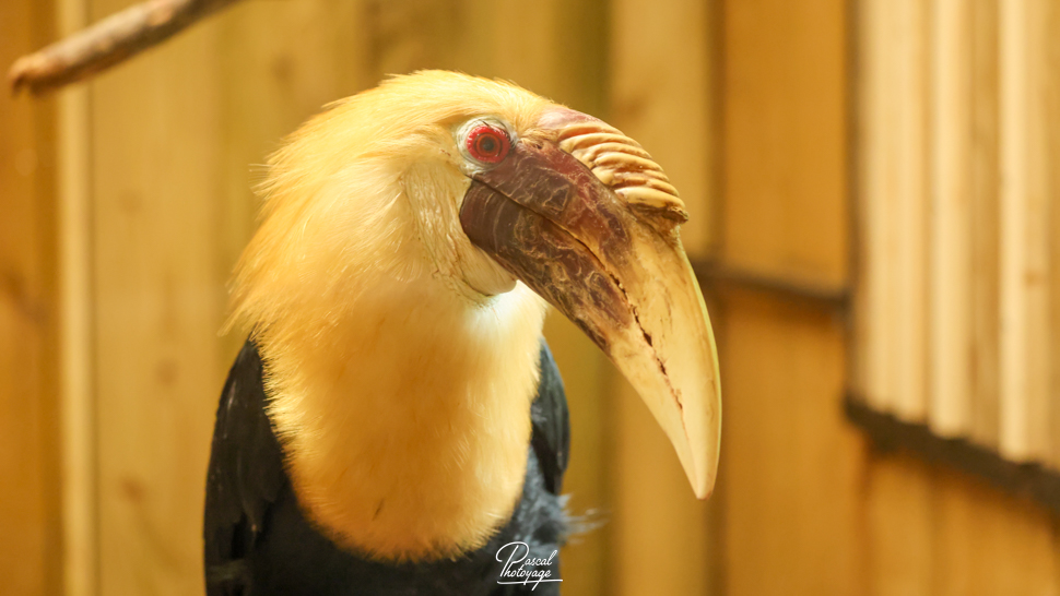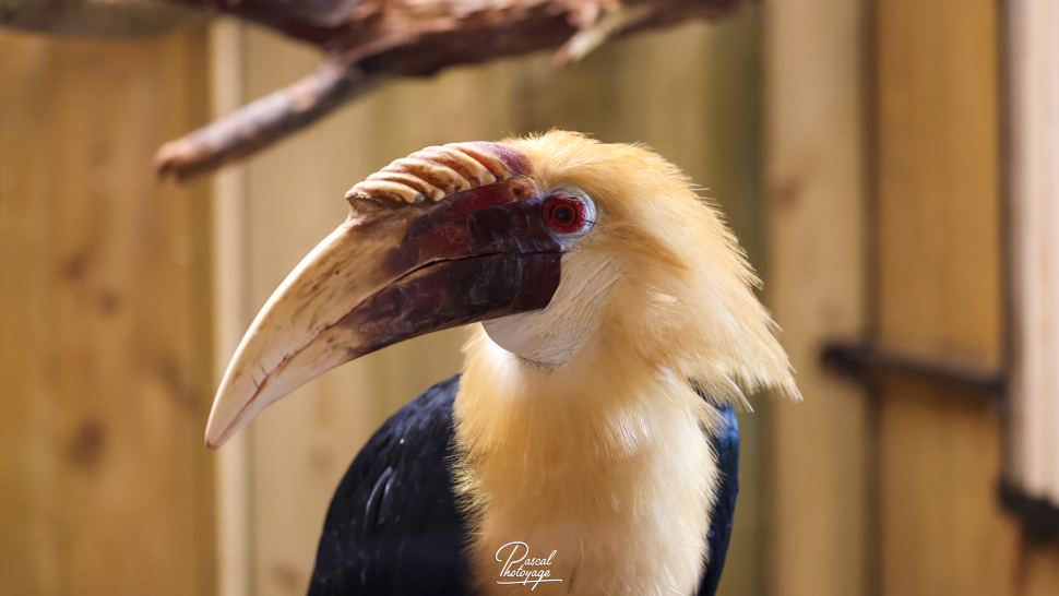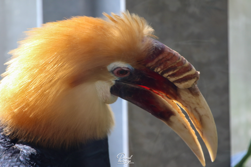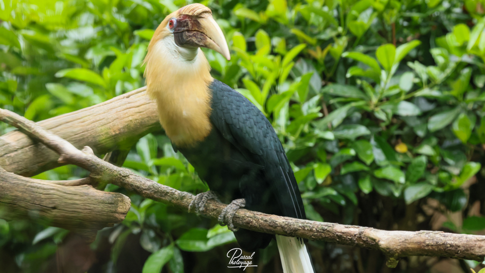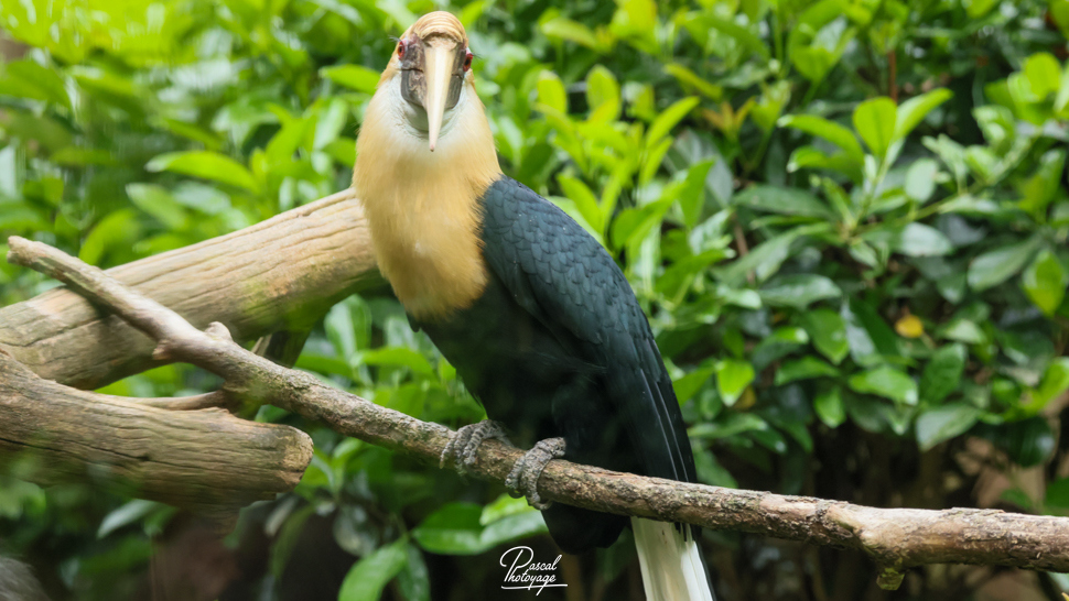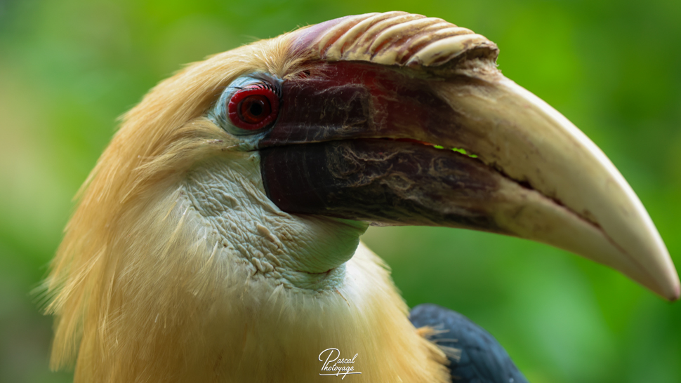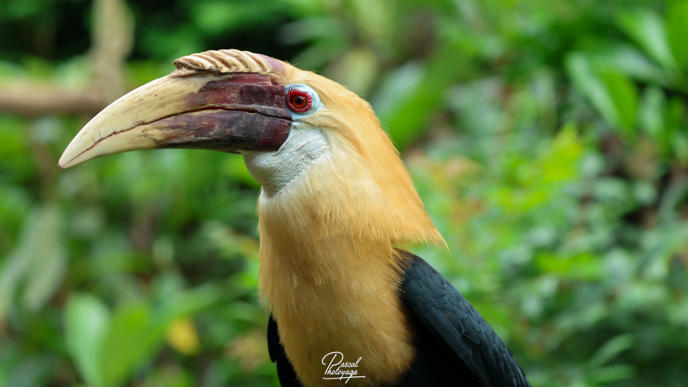 Pouvant atteindre jusqu'à 91 cm de longueur, le mâle adulte a principalement un plumage noir avec une tête dorée ou orange, une gorge et une queue blanches. Ses iris sont de couleur rougeâtre et son œil est entouré d'une peau bleue et nue. La femelle est généralement plus petite, de couleur principalement noire, avec une gorge et une queue blanches. Les deux sexes ont une très grande crête et un bec de couleur cornée. Les jeunes oiseaux des deux sexes ressemblent au mâle. Les adultes ont jusqu'à huit plis sur leur crête pâle, selon l'âge qu'ils ont, alors que les jeunes oiseaux n'en ont aucun.