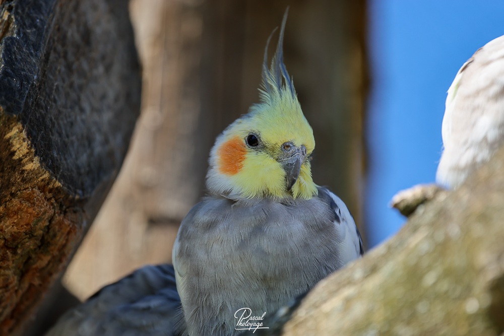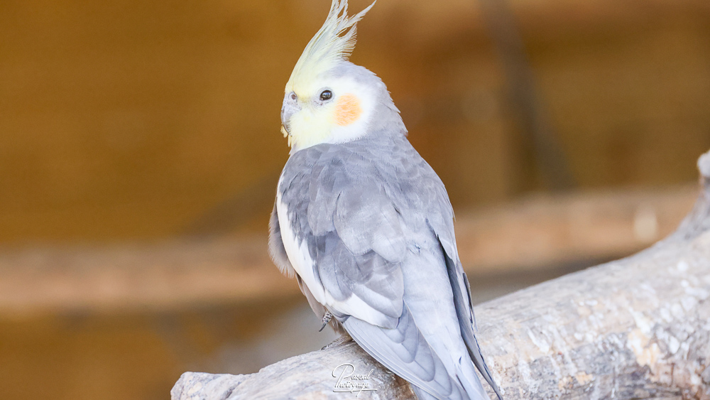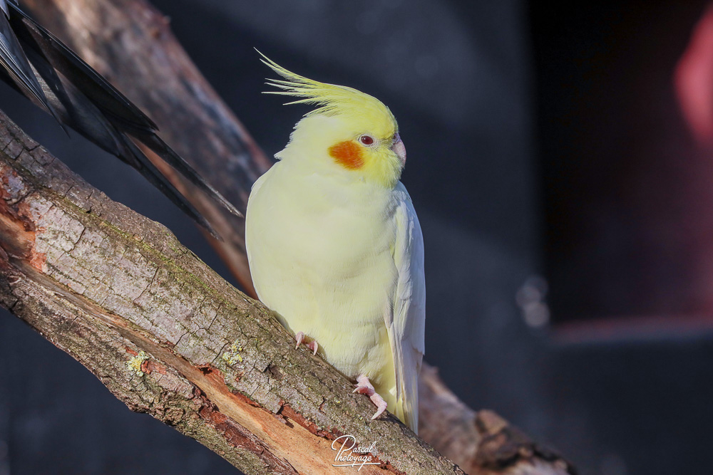 Cet oiseau mesure de 30 à 35 cm de long à l'état sauvage (jusque 37 à 40 avec une grande huppe chez les sujets en captivité issus de sélection) pour une masse de 80 à 100 g. Son plumage est gris anthracite, très foncé pouvant presque aller jusqu'au noir. La huppe et une partie de la tête sont jaunes. Deux taches rouge-orange marquent les joues. Le miroir alaire est blanc (tache sur la bordure de l'aile). La femelle ne possède pas le masque jaune, présente des stries sous la queue et des points jaunes sous les ailes. Les jeunes ressemblent à la femelle. Sa longévité serait d'environ 15 ans, mais on a observé des individus vivant jusqu'à 30 ans.