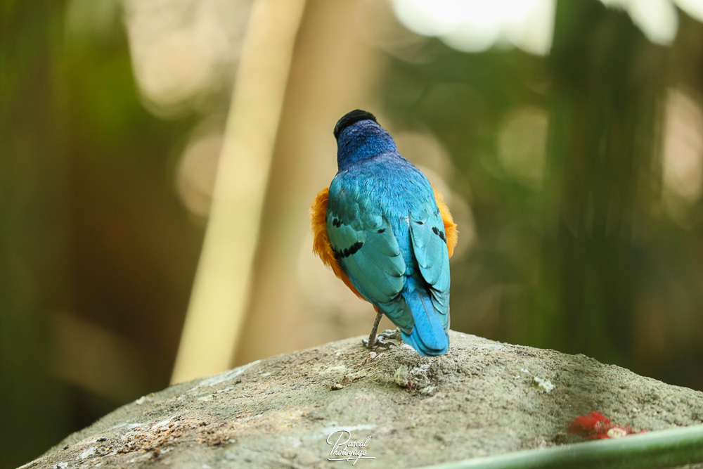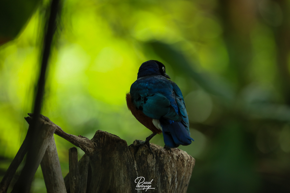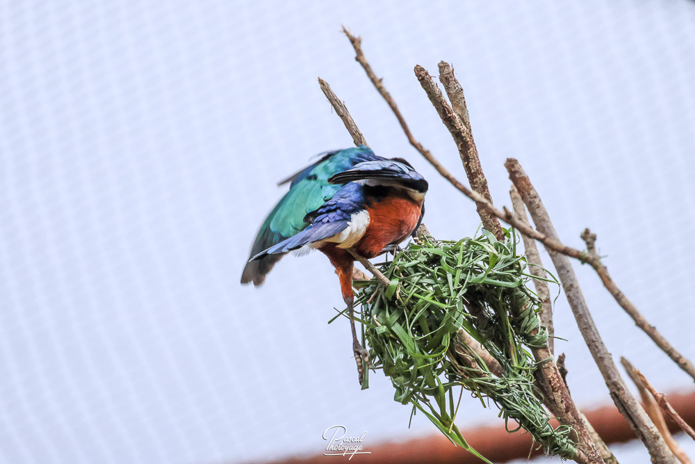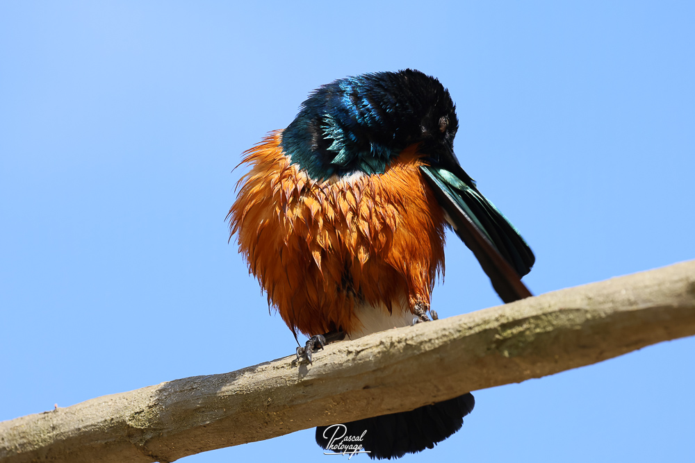 Il mesure 18 à 19 cm de long. Les adultes ont la tête noire et le dos, le haut de la poitrine, les ailes et la queue d'un bleu-vert irisé. Le ventre est rouge-orangé, séparé de la poitrine bleue par une barre blanche. Le dessous de la queue et l'intérieur du dessous des ailes est blanc. Les juvéniles ont un plumage plus terne et une très fine bande blanche sur la poitrine. Leur iris est brun, puis gris-blanc, et finalement crème à terme chez l'adulte.