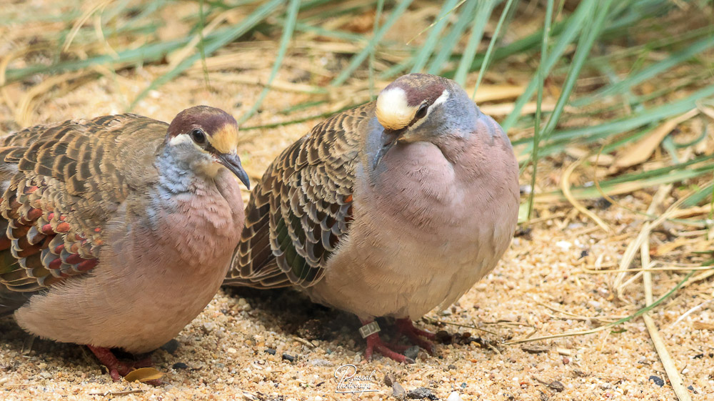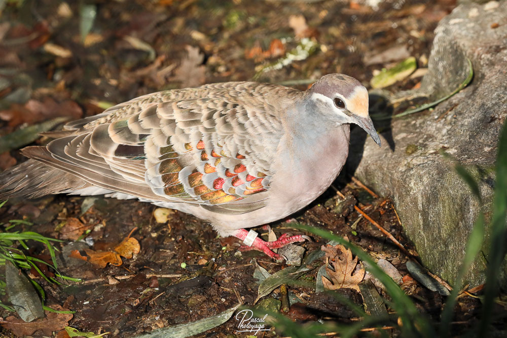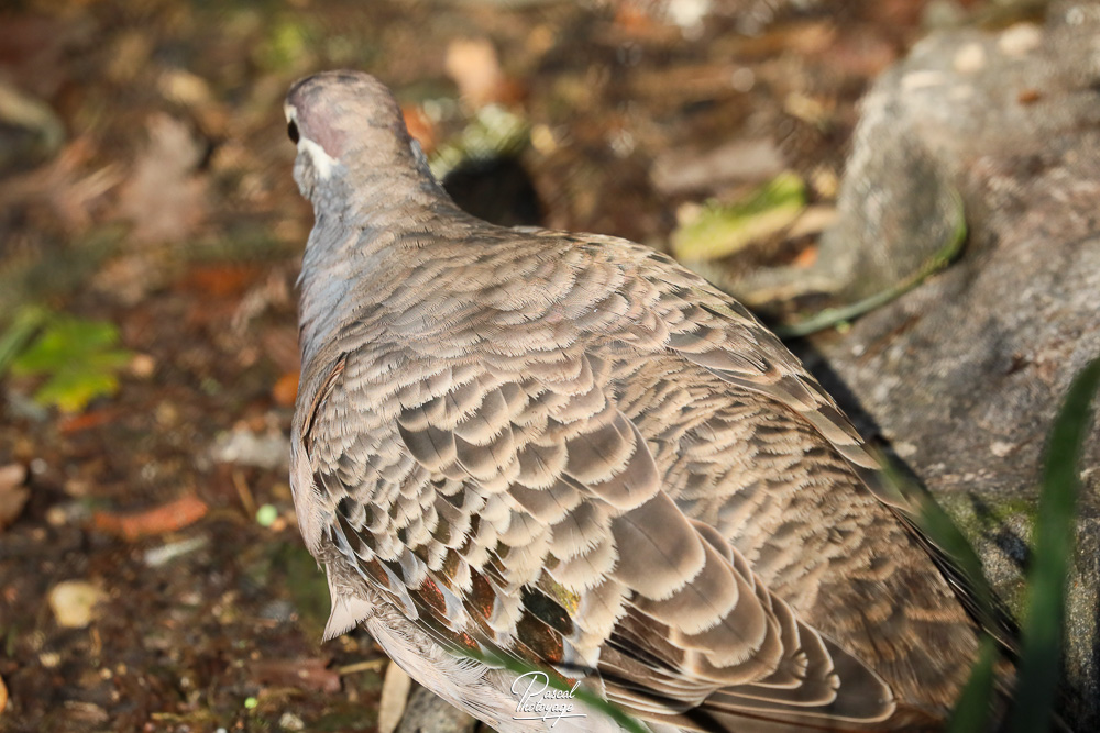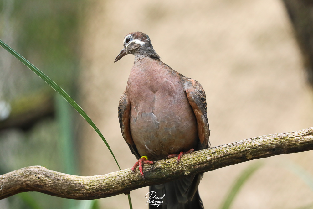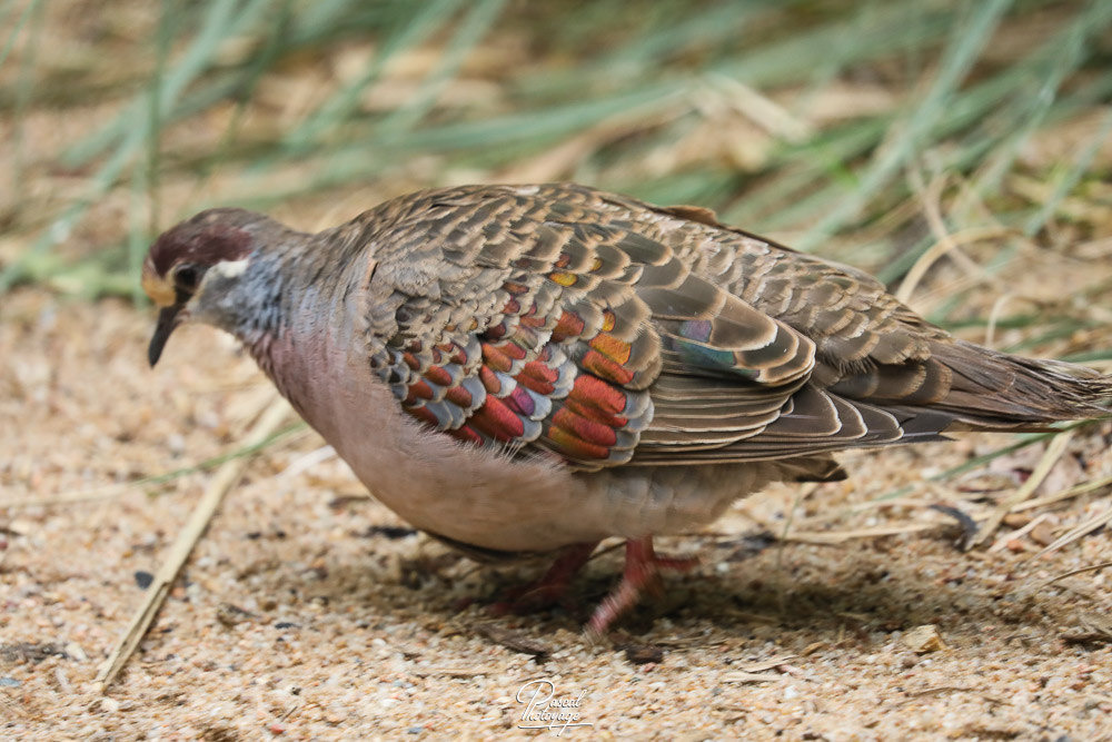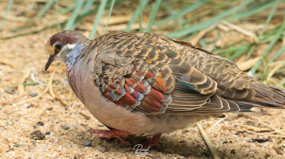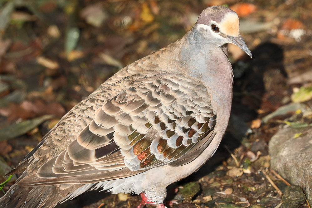 Elle mesure 30 à 36 cm de long. Le mâle a le front jaune ou blanc et la poitrine rose. Il a une ligne blanche au-dessus, au-dessous et derrière l'œil. Les ailes sont tachées de vert, de blanc et de rouge. Le reste du corps est brun. L'iris est jaune, le bec noir et, comme les autres pigeons, les pattes rouges.