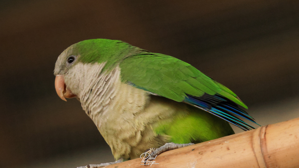Cette espèce est de couleur verte, avec le front et la poitrine gris pâle, les couvertures sus-alaires bleues et le dessous des rémiges bleu foncé. Elle mesure environ 29 cm de longueur pour une envergure de 48 cm et une masse de 100 g. Il n'y a pas de dimorphisme sexuel, cependant habituellement les femelles présentent un poids plus réduit de 10 à 20%.