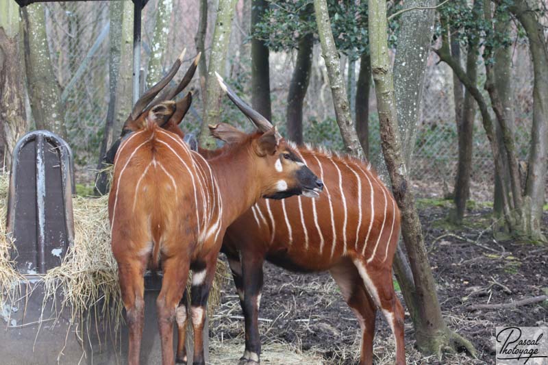 Son pelage roux est parcouru de 10 à 15 rayures blanches verticales entre l’encolure et la croupe et une crête de poils lui parcourt le dos le long de sa colonne vertébrale. Contrairement à la plupart des espèces d’antilopes, chez le bongo, mâles et femelles possèdent des cornes. Ses cornes peuvent mesurer jusqu'à 1 mètre.